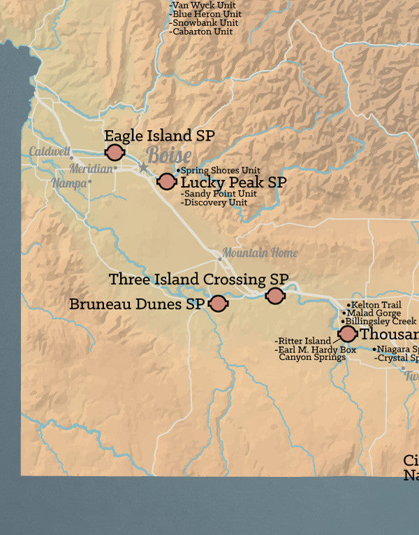 This map features all properties administered by Idaho State Parks and Recreation. Icons marking each State Park are suitable for pins or coloring in the ones you've visited. Sub-units of each park are listed as well, so you can be sure to explore everything Idaho State Parks have to offer!