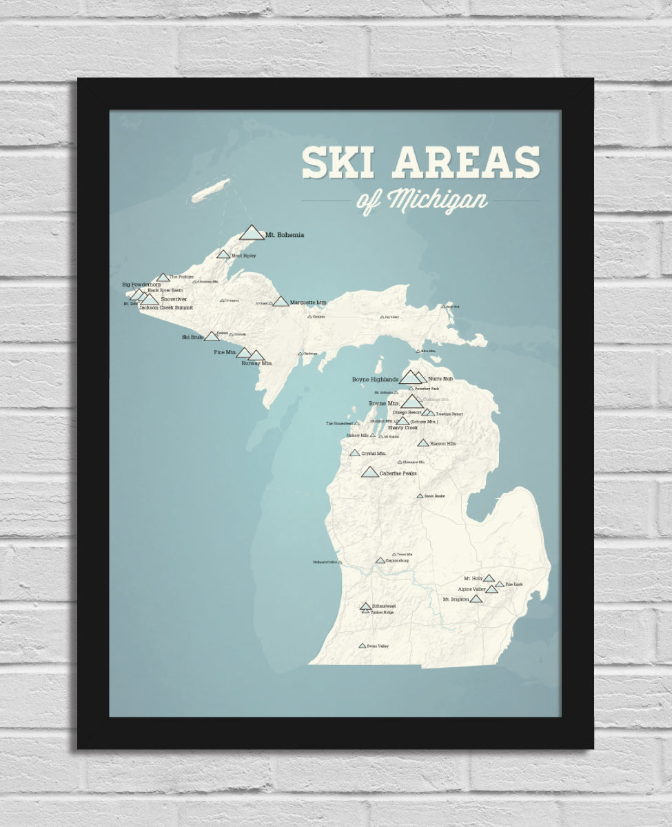 This poster is a comprehensive map of lift-served skiing in Michigan—including everything from big resorts to municipal ski hills. The stylized, shaded relief map also depicts major rivers and lakes.
