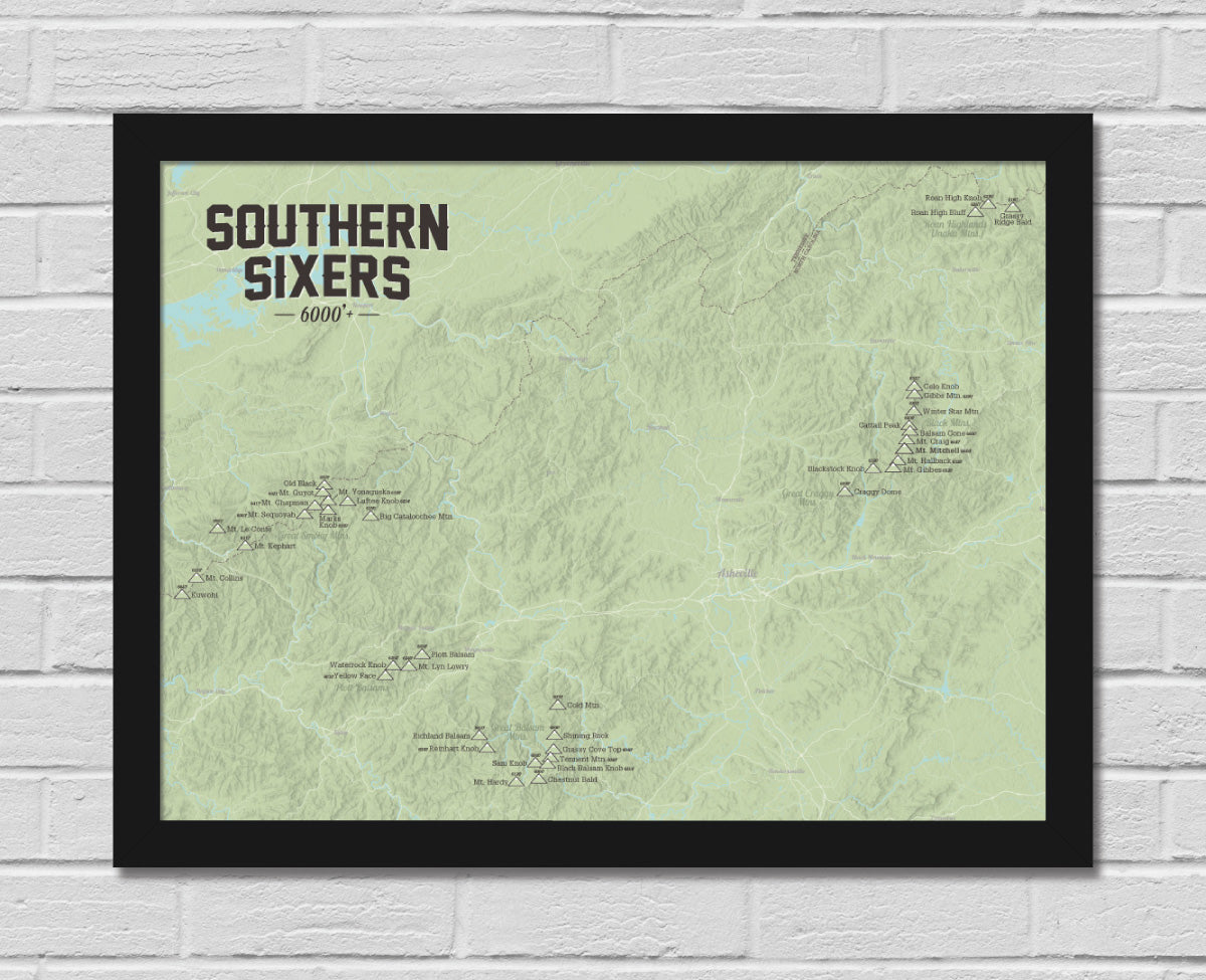 With the exception of Mt. Washington, all of the highest summits in the eastern United States can be found right here along the Tennessee/North Carolina border. This poster maps out the 40 peaks on the official list kept by Carolina Mountain Club. Hikers who complete this list become members of the 'South Beyond 6000' club. A large icon marks each mountain so it's perfect for tracking your progress with pins or coloring.