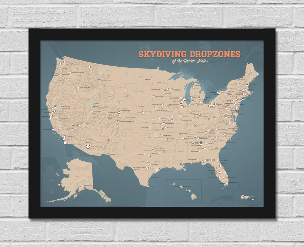 This decorative poster is a comprehensive map featuring ~230 dropzones in the United States—including Alaska, Hawaii & Puerto Rico. It's sure to bring back memories and introduce you to some new places to jump. Tandem-only operations and private DZs are noted with faded icons and labels. Icons marking each dropzone are perfect for pinning or coloring in the ones you've jumped at.