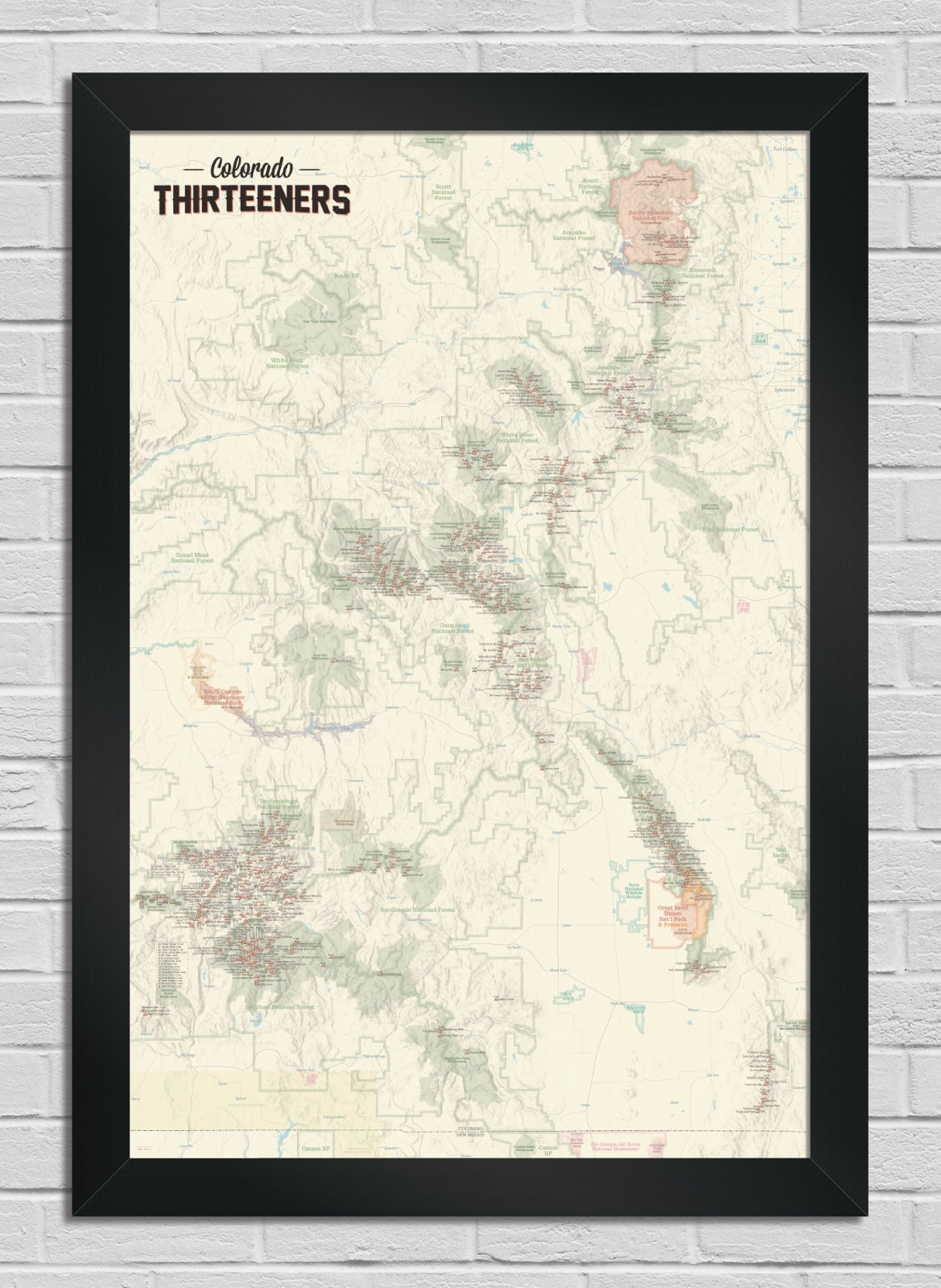 This decorative poster maps all 582 ranked 13ers in Colorado. If you've finished the 14ers and would like to turn your hobby into an obsession, this is the perfect list for you! The map is designed for peakbaggers to track their progress as they complete the list.