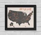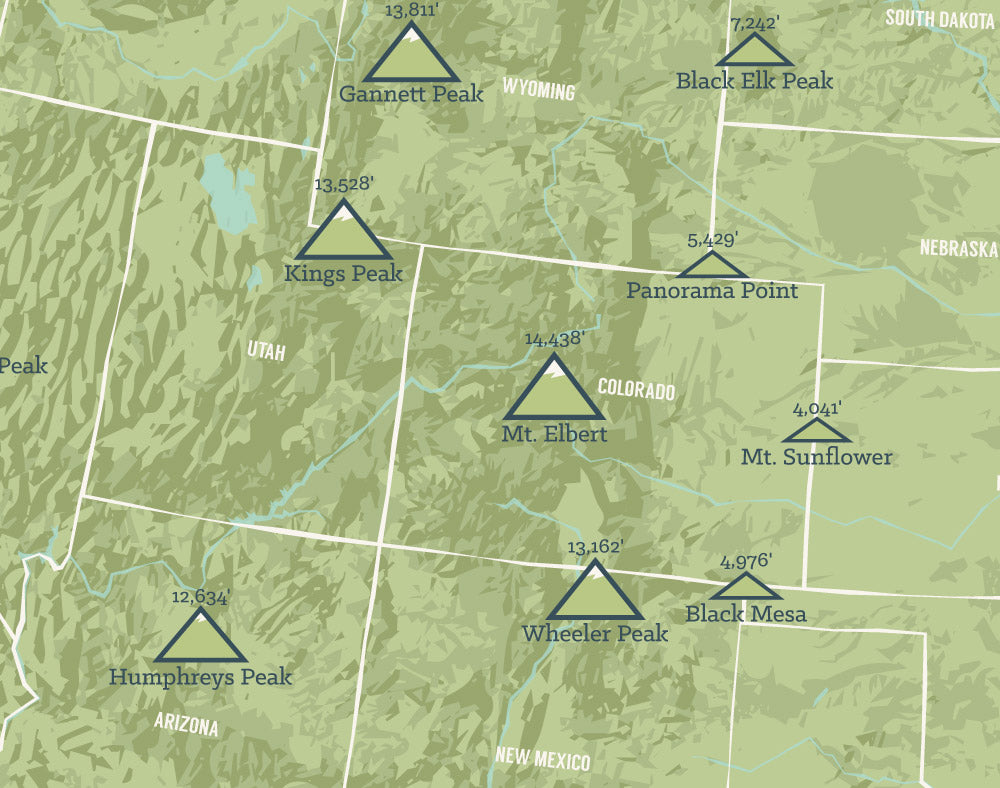 Peak lists don't get more diverse than this—from gentle hills in the southeast to 20k' Denali. Highpointing is quite an adventure, and this map will help you track your progress. This small poster maps out the highest point in all 50 states in a modern, colorful style. Icons are sized according to the peak's summit elevation, and the snow cap shows the percentage above treeline. You can use this map as a decorative checklist by pinning or coloring the icons.