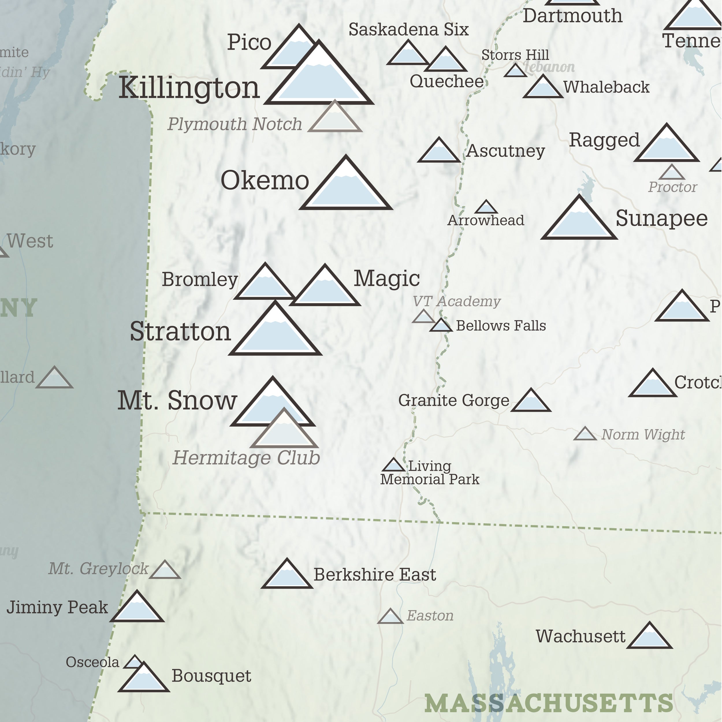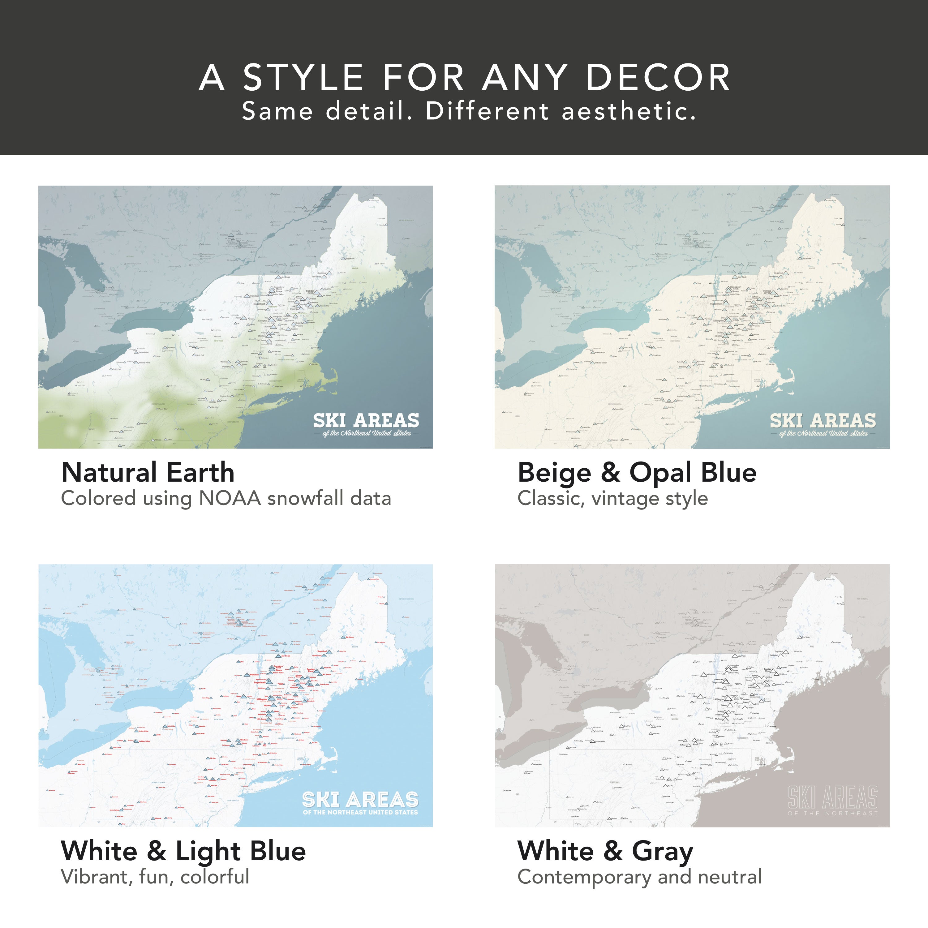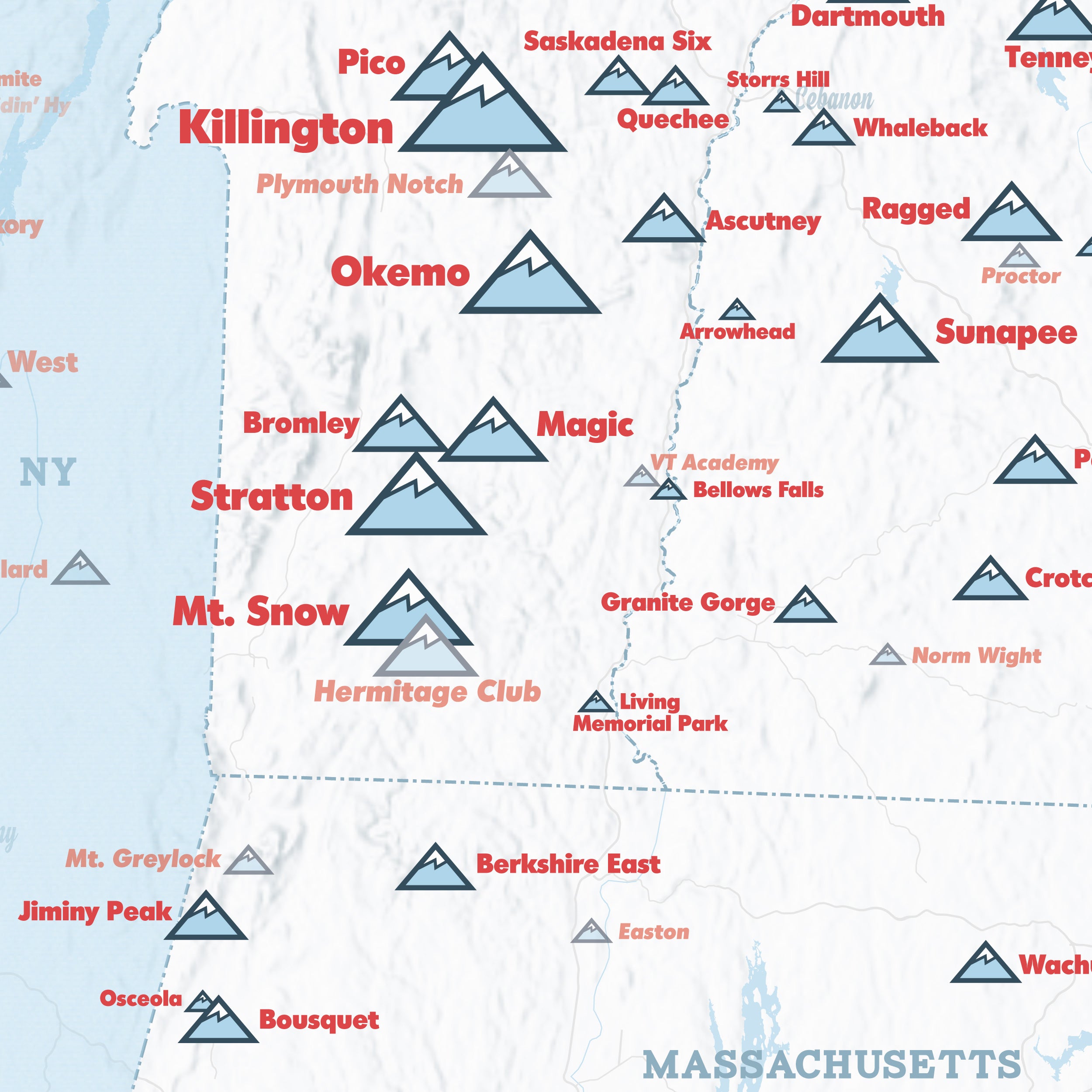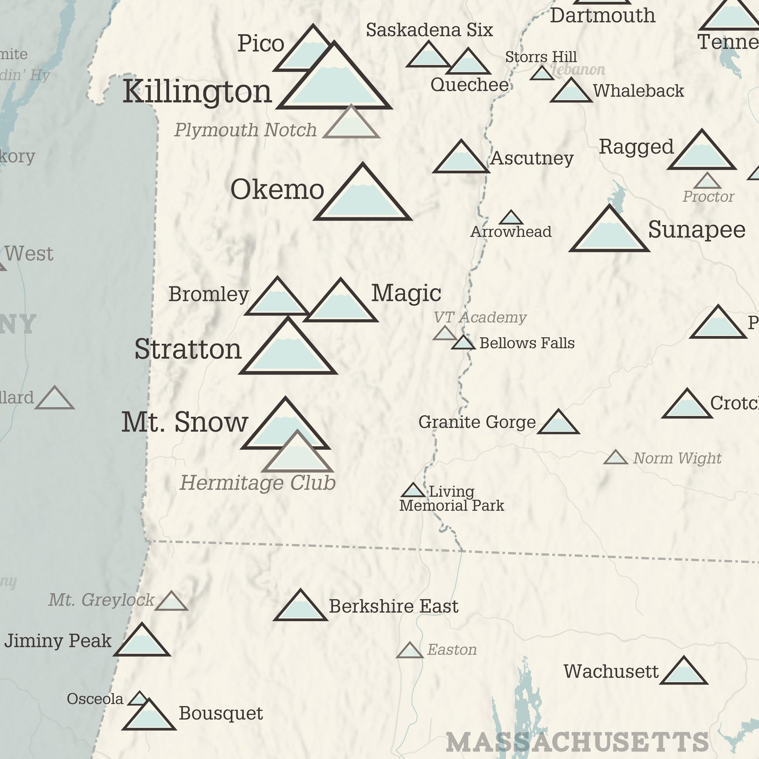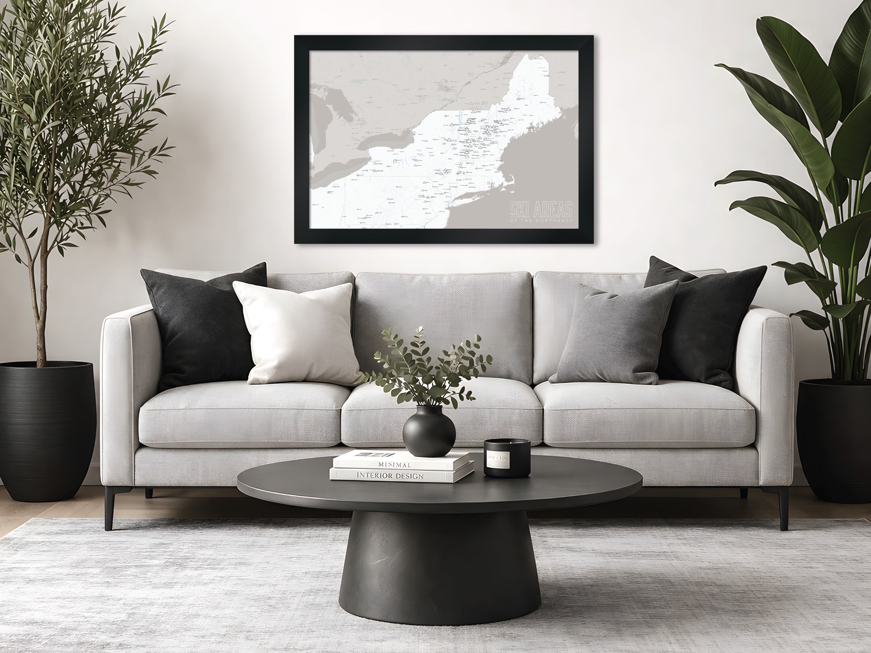 Skiing and snowboarding map posters featuring ski resorts across the United States, Canada, and North America. These maps highlight resort locations and geography, making them ideal for tracking resorts, planning trips, or exploring ski areas.