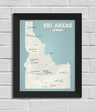 This small poster is a comprehensive map of lift-served skiing in Idaho—home of the world's first chairlift. The design features everything from large resorts to smaller ski hills. It's perfect for tracking the areas you've skied by pinning or coloring the icons.