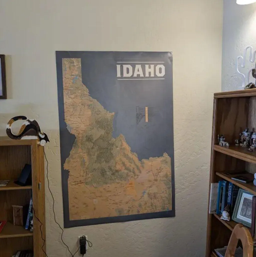 This decorative wall map of Idaho features brilliant colors, a unique styling, and extensive detail. It includes: