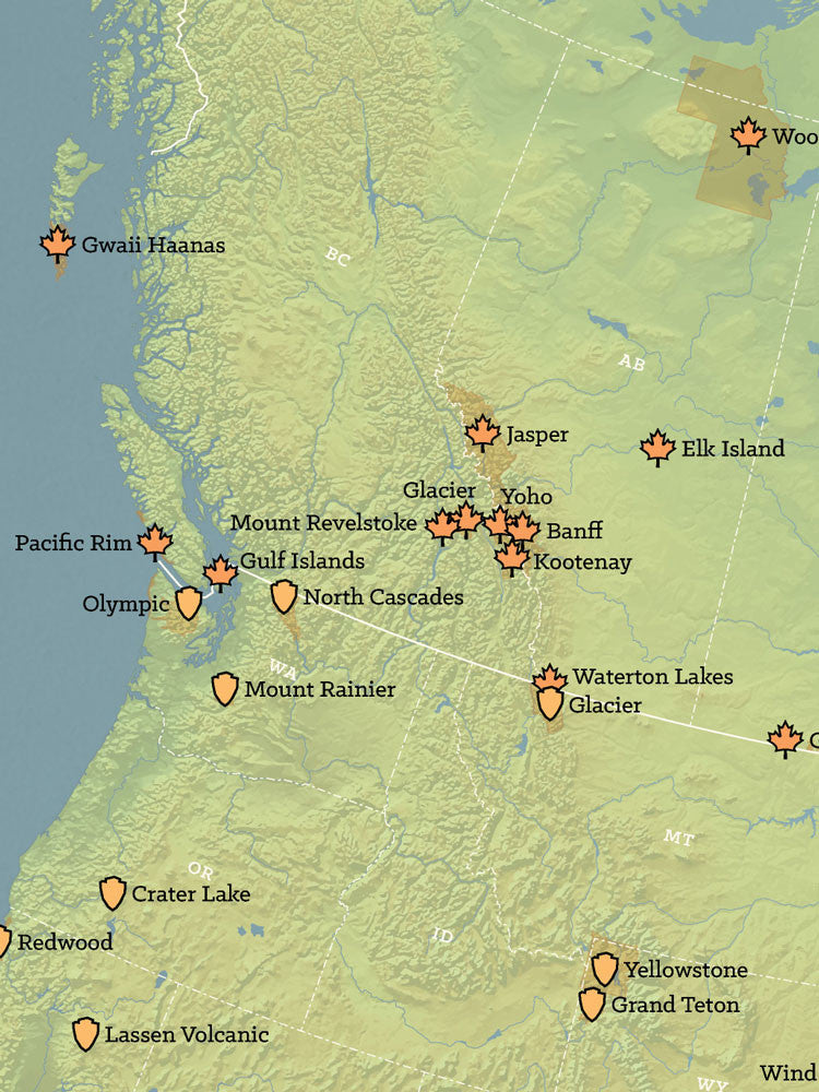This smaller-sized version of our North America National Parks map focuses on National Parks in Canada, United States and Mexico. Unlike the larger version, individual parks in Central America and the Caribbean are not labeled. This version is perfect for National Park lovers who don't do as much traveling in the tropics.