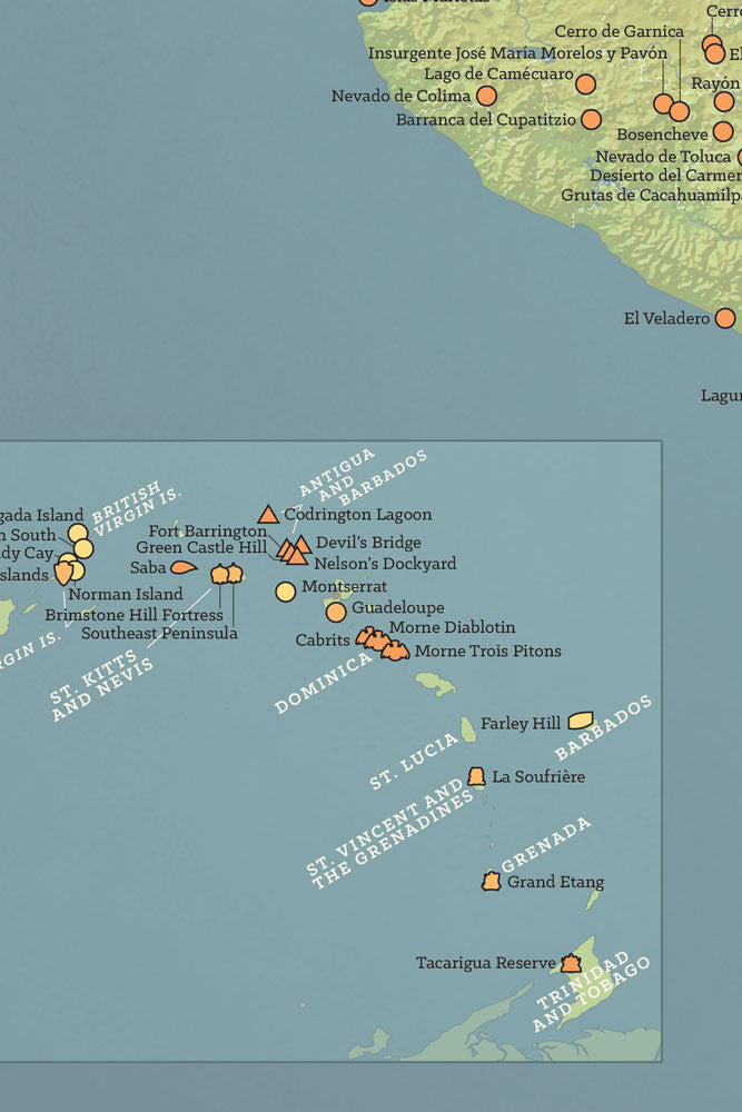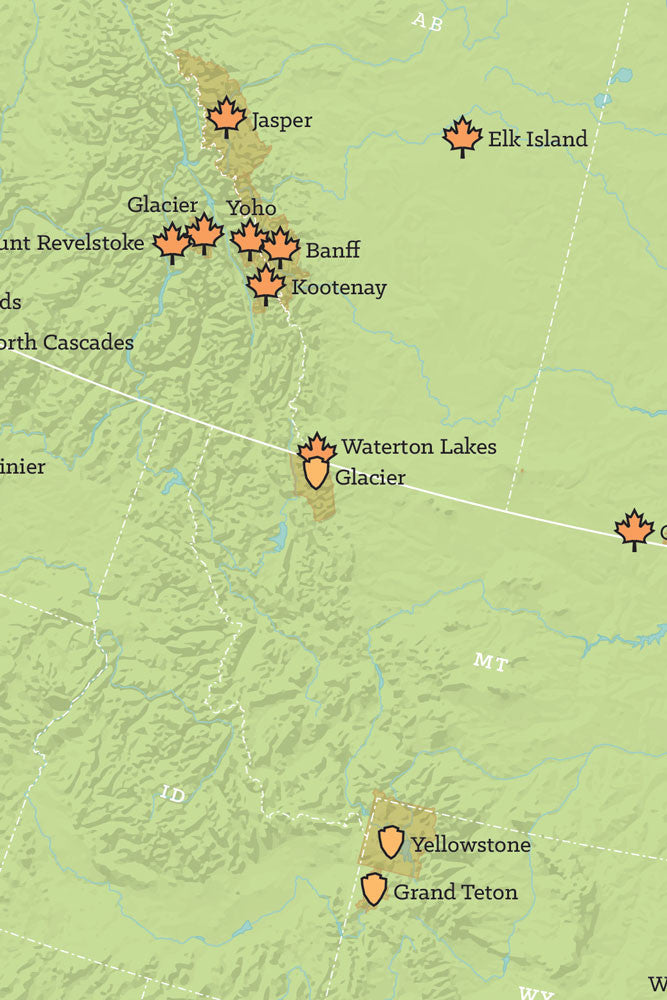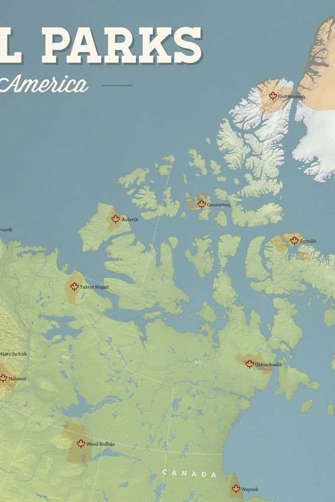 This decorative poster showcases areas throughout the North American continent designated as National Parks. Each park is marked with an icon in addition to the park boundaries being colored. This map is perfect for national park lovers who travel to Canada, Mexico and beyond. Icons marking each park are suitable for pins or coloring so you can track where you've visited.