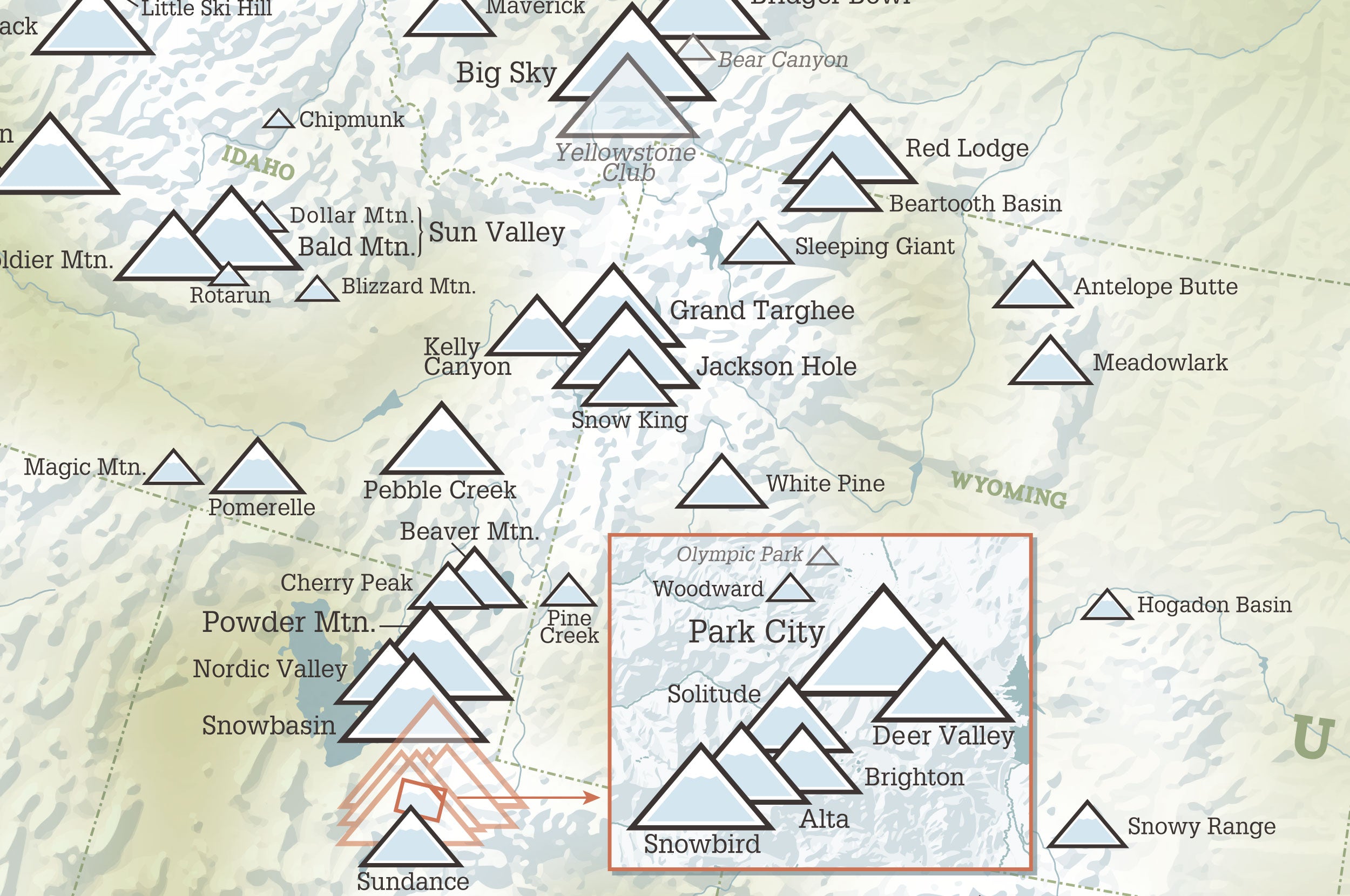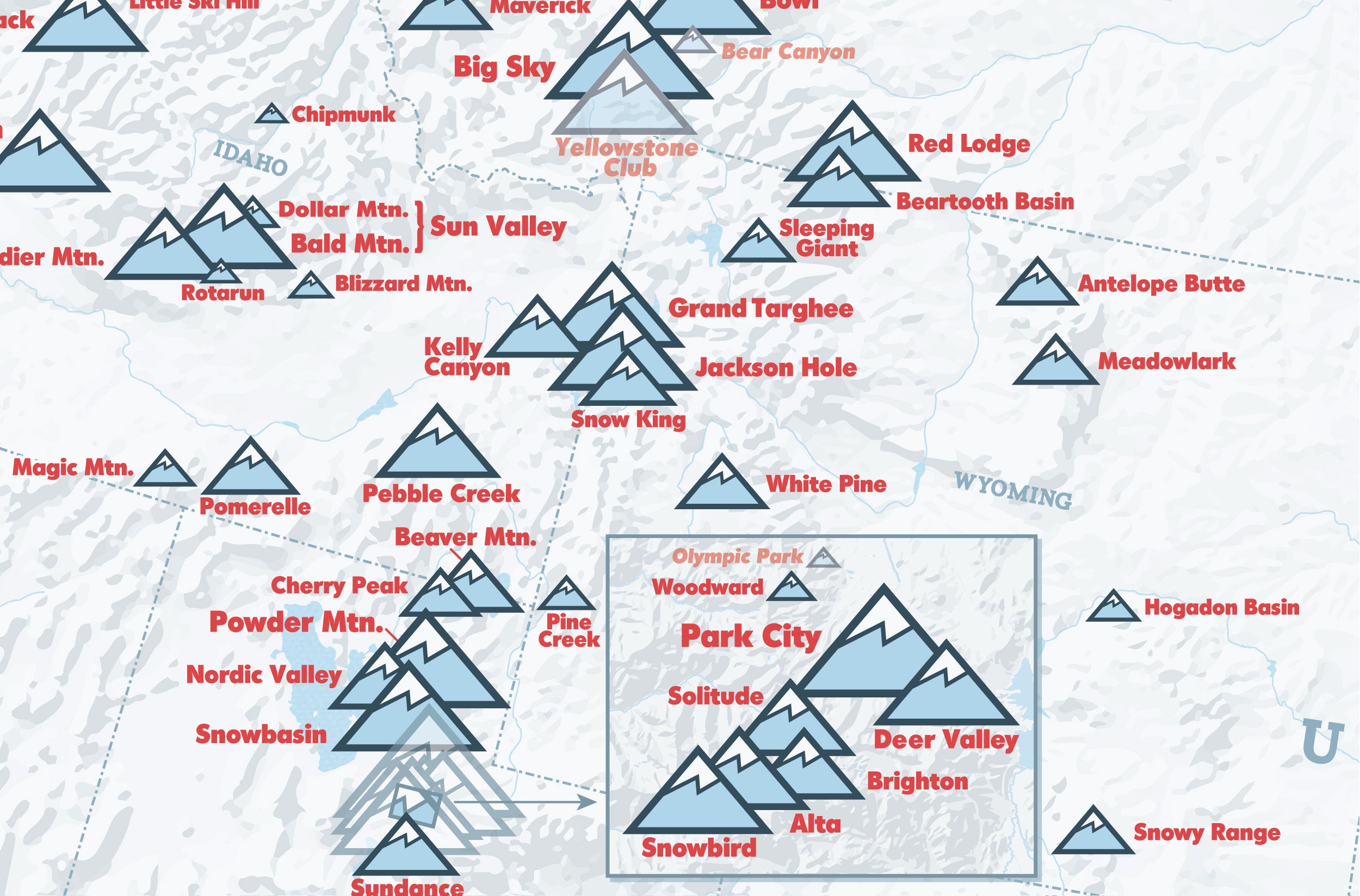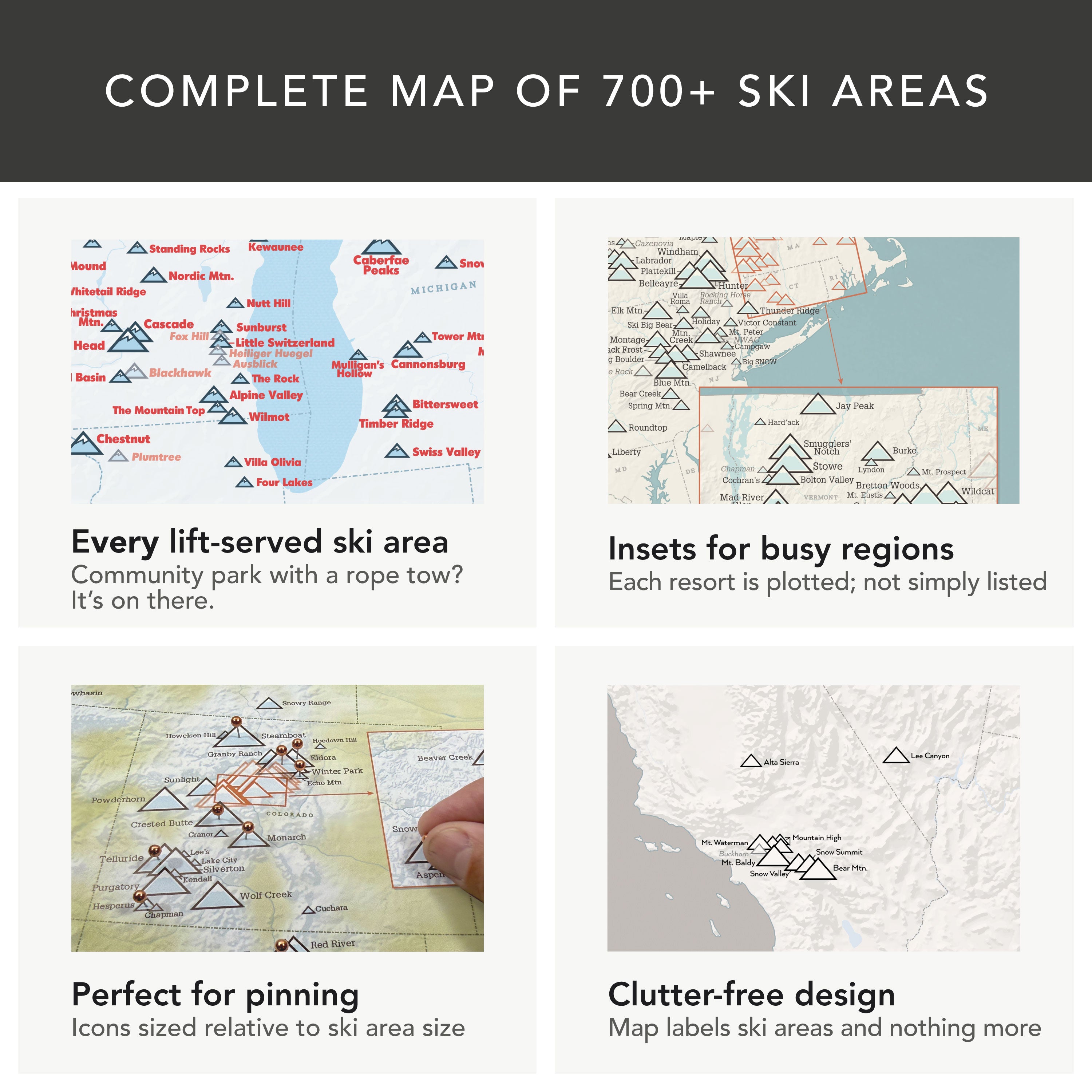 Magnified insets bring clarity to the most concentrated ski regions: Lake Tahoe, the Wasatch Range, Summit County/Aspen, Laurentians, and New England.