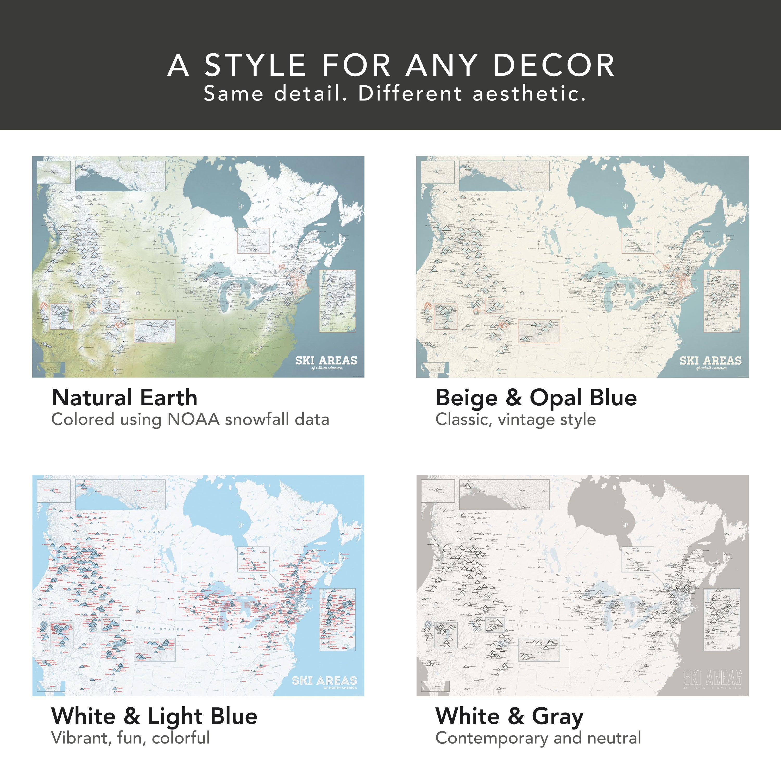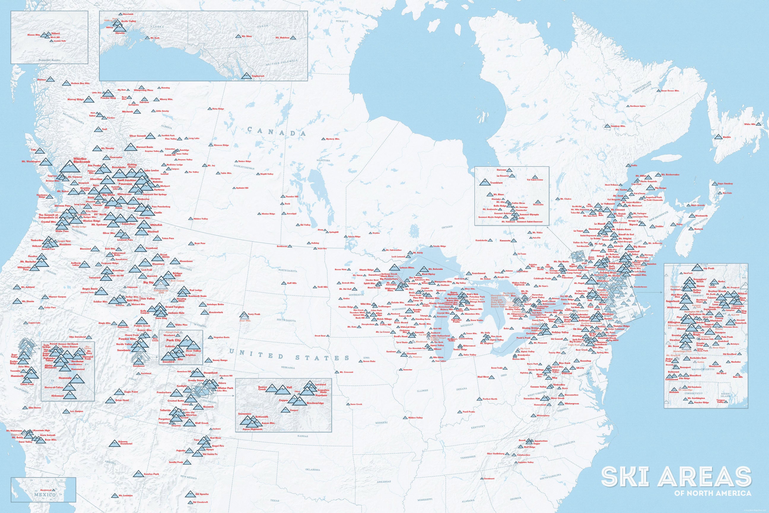 Canada’s major ski regions—from British Columbia to Nova Scotia—are fully represented, making this the definitive map for North American skiing.